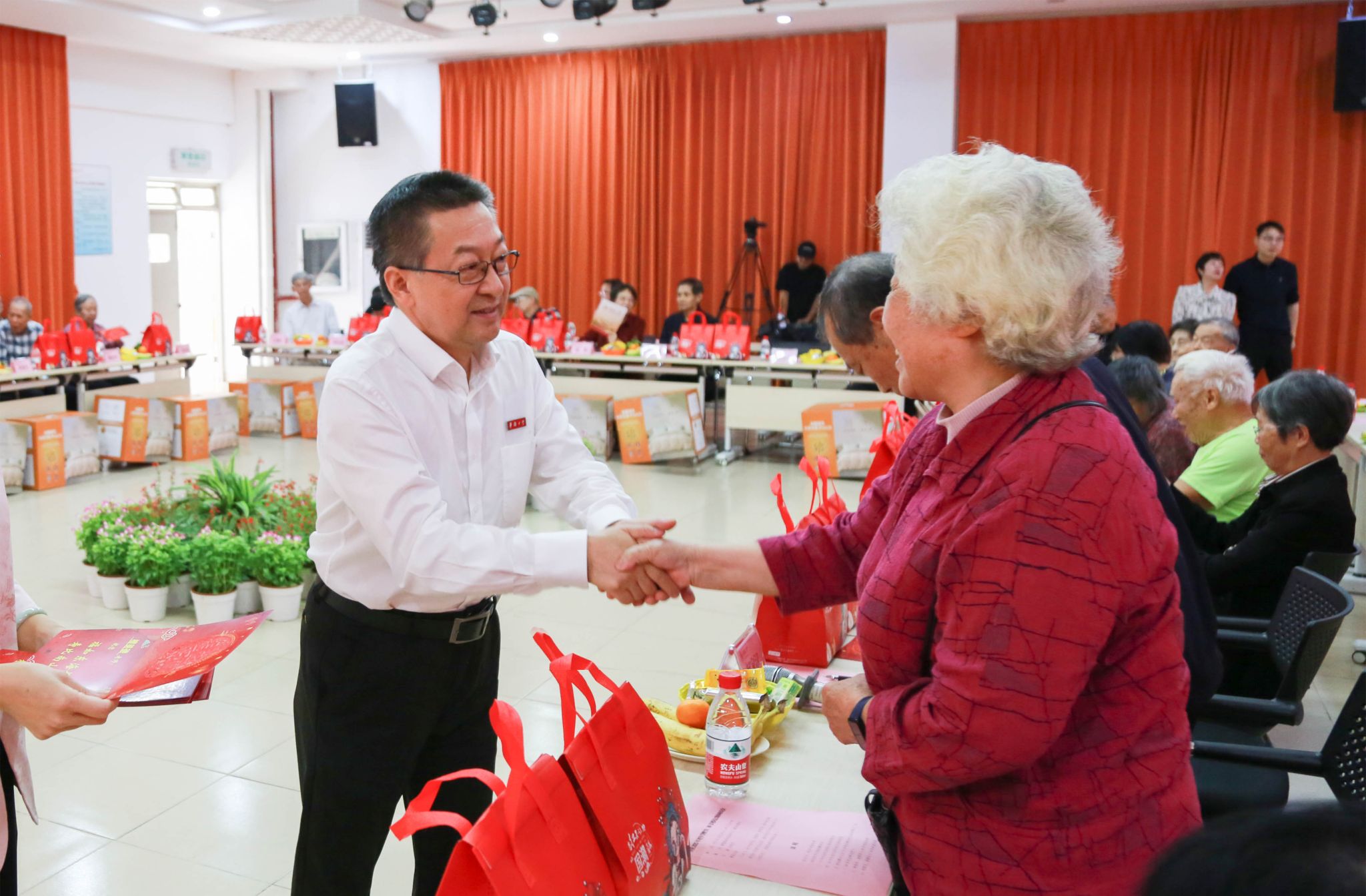 徐西鹏为70岁、80岁寿星赠送纪念品和贺卡等礼品