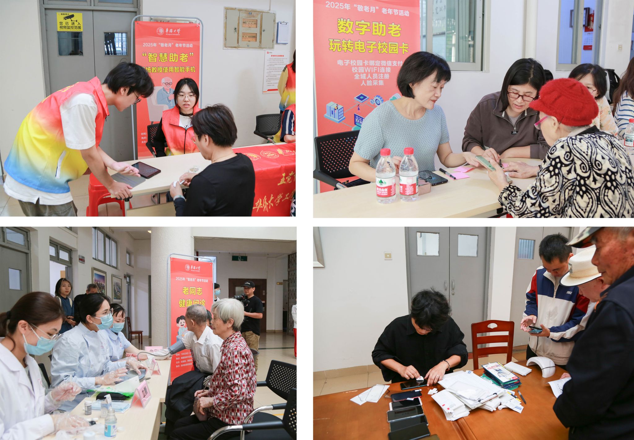 今年学校在祝寿会期间还安排了健康问诊、法律咨询、剪纸祝寿、“智慧助老”手机教学、“数字助老”玩转电子校园卡、银发义剪、免费手机贴膜、拍照打卡、剪纸祝寿等系列敬老活动,吸引众多离退休老同志积极参与。