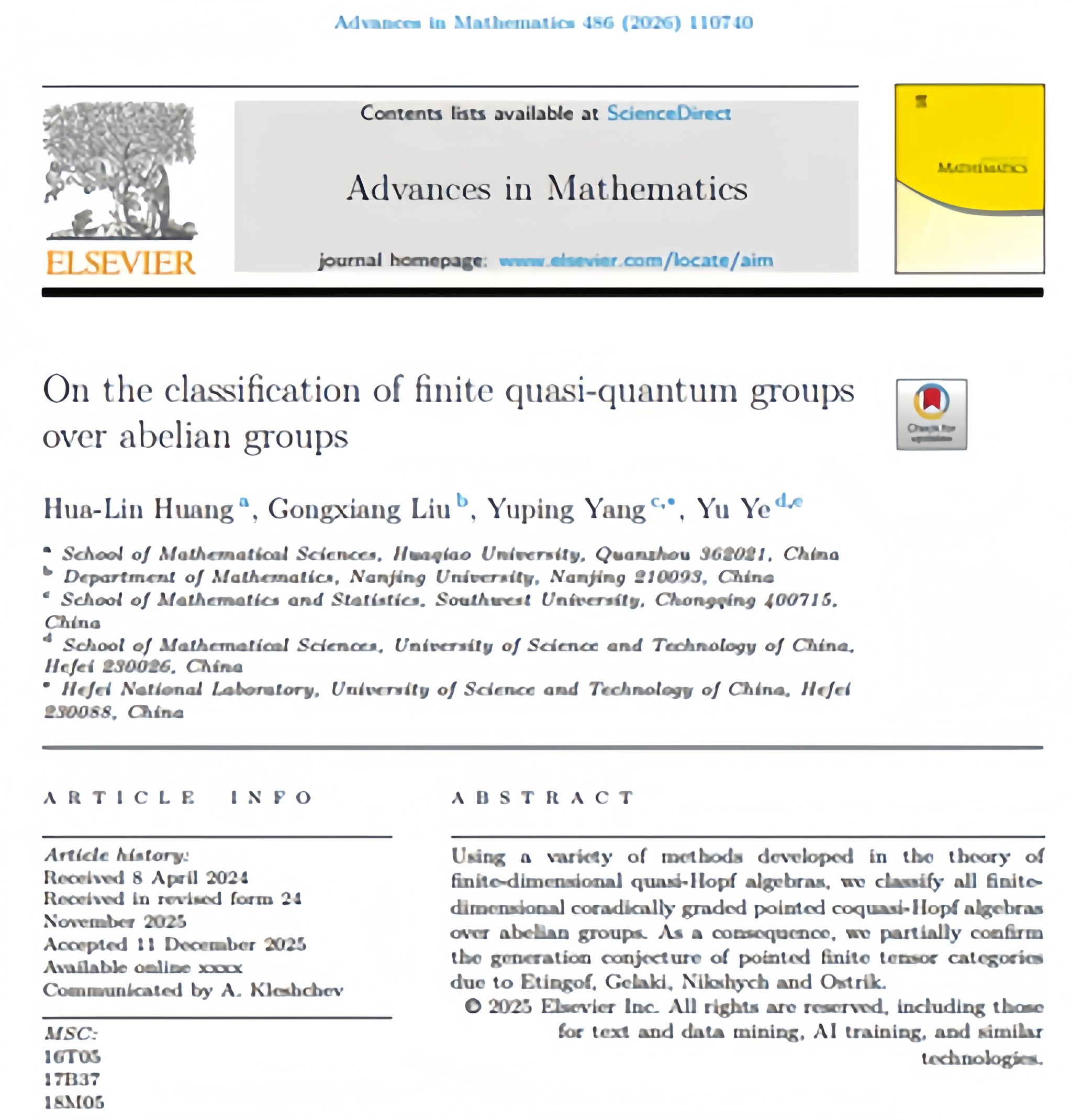 近日,beat365中文在线官网数学科学学院黄华林教授与合作者在国际顶尖数学期刊《数学进展》(Advances in Mathematics)上发表了最新研究成果On the classification offinitequasi-quantum groups over abelian groups。