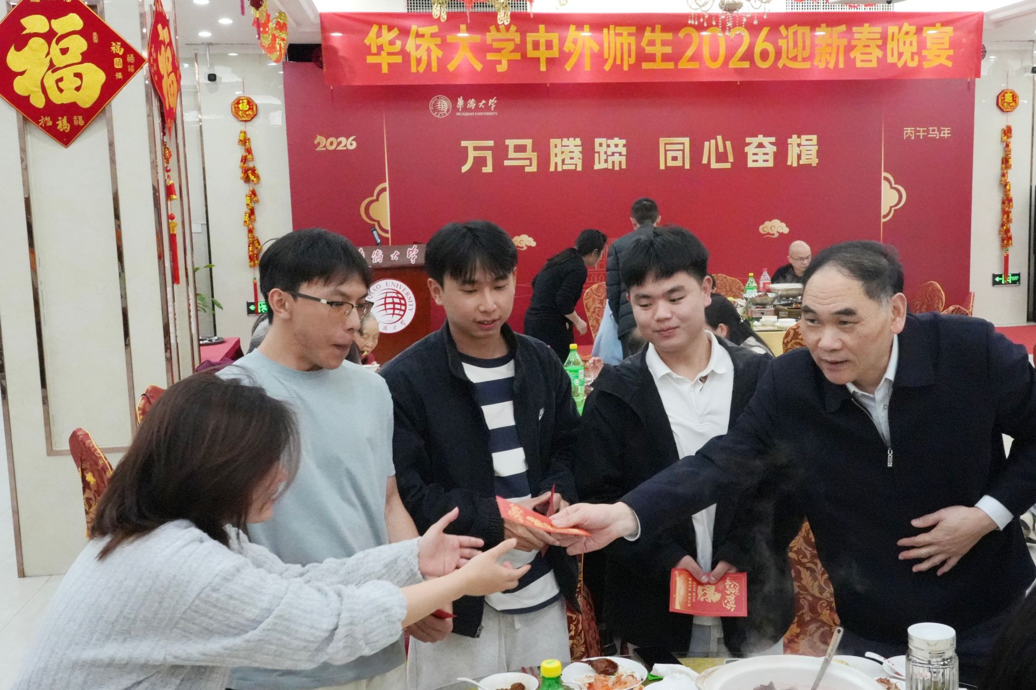 除了丰盛的团圆饭,beat365中文在线官网校领导徐西鹏、吴剑平、王秀勇、何纯正、黄辉、缑锦等还现场向学生们派发了压岁钱,向留校师生致以新春的美好祝福。接过象征吉祥如意、前程似锦的红包,学生们纷纷合影留念,将这份新春喜悦分享给远方的家人和朋友。