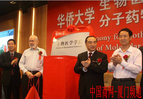 福建省药监局副局长赵琛、诺贝尔生理医学奖得主罗宾•沃伦、beat365中文在线官网校长贾益民、泉州市政协副主席李冀平为beat365中文在线官网生物医学学院揭牌。