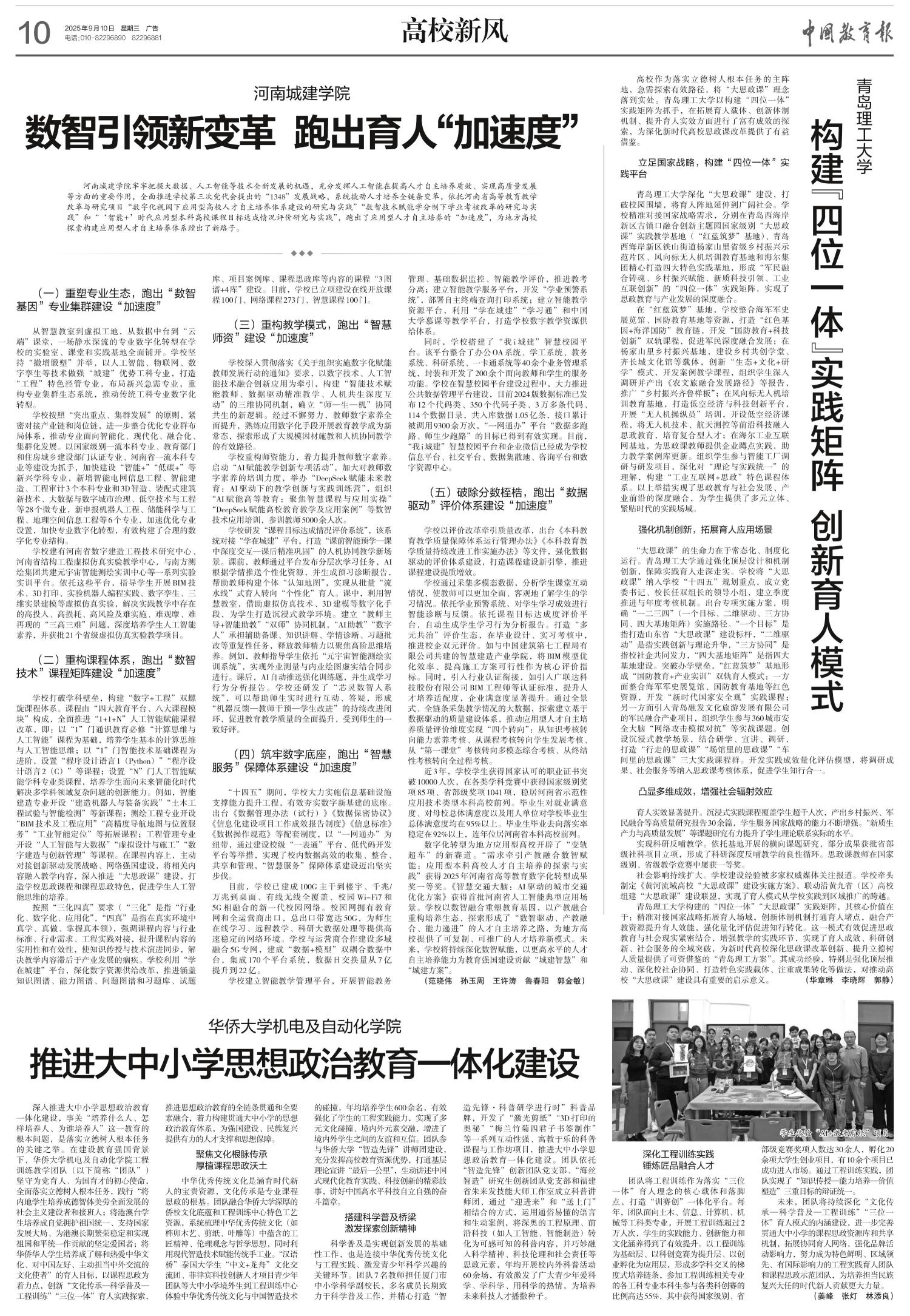 深入推进大中小学思想政治教育一体化建设,事关“培养什么人、怎样培养人、为谁培养人”这一教育的根本问题,是落实立德树人根本任务的关键之举。在建设教育强国背景下,beat365中文在线官网机电及自动化学院工程训练教学团队(以下简称“团队”)坚守为党育人、为国育才的初心使命,全面落实立德树人根本任务,践行“将内地学生培养成德智体美劳全面发展的社会主义建设者和接班人;将港澳台学生培养成自觉拥护祖国统一、支持国家发展大局、为港澳长期繁荣稳定和实现祖国和平统一作贡献的坚定爱国者;将华侨华人学生培养成了解和热爱中华文化、对中国友好、主动担当中外交流的文化使者”的育人目标,以课程思政为着力点,创新“文化传承—科学普及—工程训练”“三位一体”育人实践探索,推进思想政治教育的全链条贯通和全要素融合,着力构建贯通大中小学的思想政治教育体系,为强国建设、民族复兴提供有力的人才支撑和思想保障。