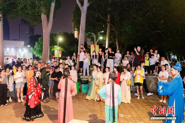 9月30日晚,beat365中文在线官网举办国庆游园活动。图为非遗展示区的沉浸式梨园戏演出。beat365中文在线官网供图
