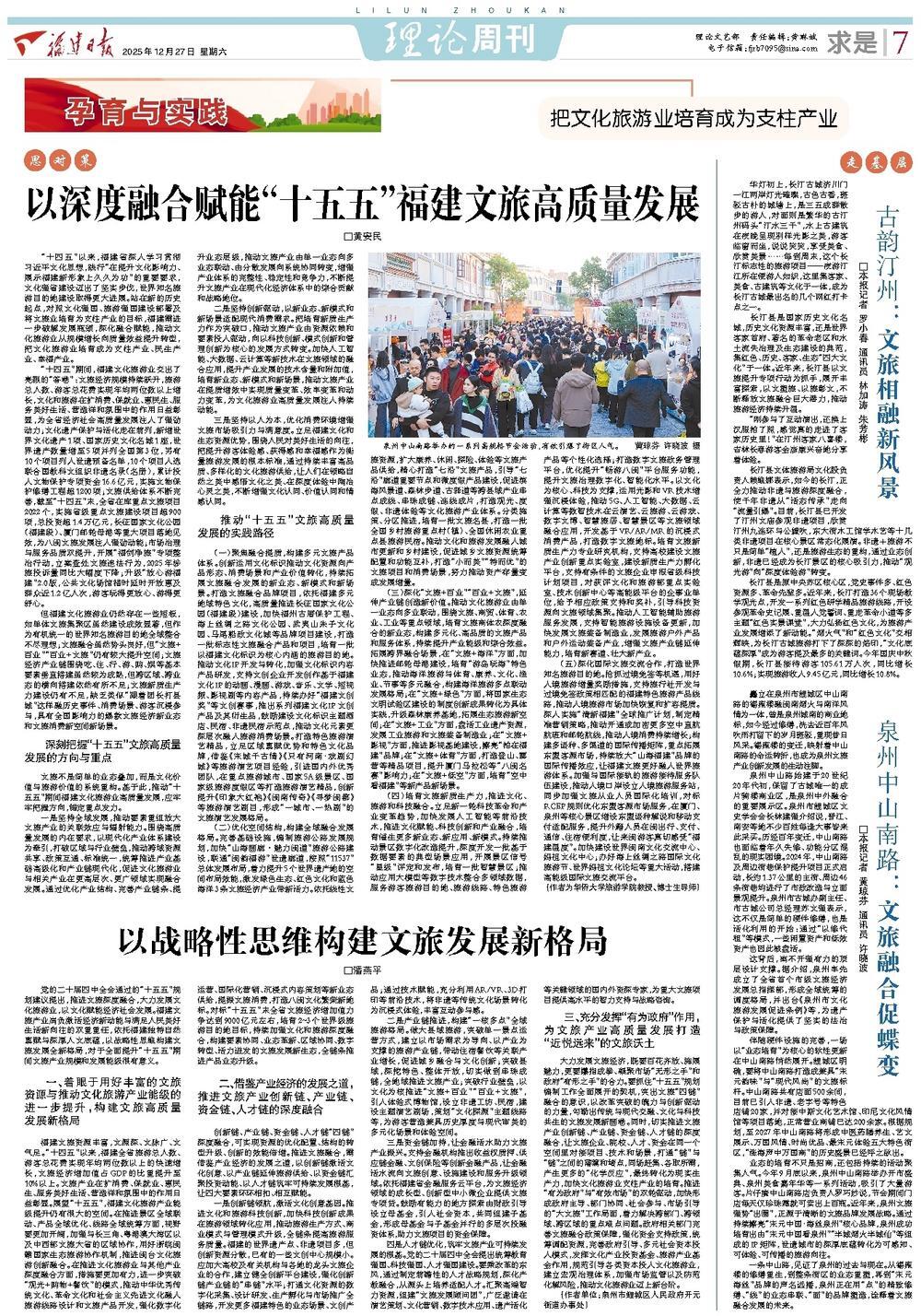 “十四五”以来,福建省深入学习贯彻习近平文化思想,践行“在提升文化影响力、展示福建新形象上久久为功”的重要要求,文化强省建设迈出了坚实步伐,世界知名旅游目的地建设取得更大进展。站在新的历史起点,对照文化强国、旅游强国建设部署及将文旅业培育为支柱产业的目标,福建需进一步破解发展瓶颈,深化融合赋能,推动文化旅游业从规模增长向质量效益提升转型,把文化旅游业培育成为支柱产业、民生产业、幸福产业。