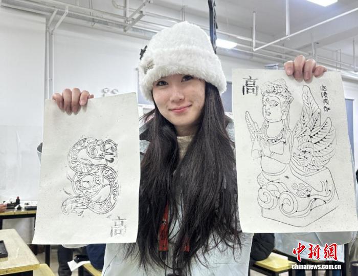 在西夏文木活字印刷体验中,营员们亲手拓印西夏图案及专属的西夏文姓氏。来自台湾的高婷萱手持自己制作的两幅作品,拍照“打卡”:“蛇的图案寓意‘蛇’来运转,妙音鸟(迦陵频伽)则是西夏文化中的常见元素。”