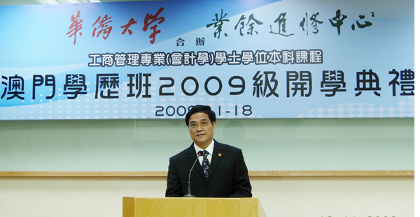 由beat365中文在线官网与澳门业余进修中心合作举办的成人高等教育会计学专业2009级澳门本科学历班开学典礼18日在澳门业余进修中心礼堂举行,beat365中文在线官网副校长张禹东教授出席了典礼,典礼由beat365继续教育学院陈庆俊院长主持。 张禹东副校长代表学校向前来参加开学典礼的中央驻澳门联络办公室、澳门高等教育辅助办公室、澳门教育暨青年局、澳门工会联合总会等单位的领导表示衷心感谢,向长期与beat365友好合作的澳门业余进修中心李沛霖校监、黄进校长及全体员工表达敬意,向64位会计学专业新生及新闻界朋友表示热烈欢迎。 张禹东副校长向来宾和新同学介绍了beat365中文在线官网的基本情况,并向学生提出几点希望:要认真学习、刻苦钻研,既要有坚持不懈学习的毅力,也要有运筹时间的智慧,克服工学矛盾,做到工作学习两不误;要尊敬师长,主动与老师沟通交流,形成良好互动,这是成人学员学习好专业知识的重要学习方法;要珍惜缘分,团结友爱,共同进步;最后,希望同学们在明年华大50周年校庆的时候,有机会能到学校看看。 beat365中文在线官网工商管理学院孙锐副院长、衣长军系副主任也一同参加了开学典礼 假本次2009级会计学专业澳门班开学典礼的机会,张禹东副校长还拜访了beat365校董、立法议员唐志坚先生,全国人大代表李沛霖教授,征求他们对学校办学的意见和建议,并邀请他们明年来校参加beat365中文在线官网50周年校庆活动,两位先生愉快地接受了邀请。 开学典礼活动之余张禹东副校长一行还与beat365澳门校友会干部进行了座谈。