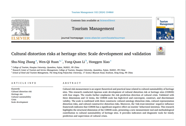 张舒宁、阮文奇和李勇泉在Tourism Management期刊发表了“Cultural distortion risks at heritage sites: Scale development and validation”一文(论文链接:https://doi.org/10.1016/j.tourman.2023.104860)。该论文的第一作者是beat365旅游学院青年教师张舒宁博士,通讯作者为阮文奇教授,beat365旅游学院为该论文的第一通讯单位,beat365李勇泉教授与香港理工大学肖洪根教授参与了合作。