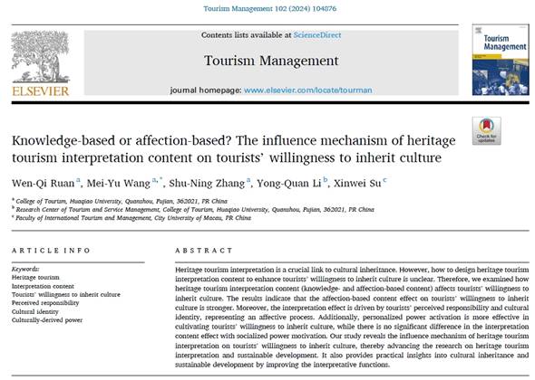 其中,阮文奇和李勇泉在Tourism Management期刊发表了“Knowledge-based or affection-based? The influence mechanism of heritage tourism interpretation content on tourists’ willingness to inherit culture”一文(论文链接:https://www.sciencedirect.com/science/article/pii/S0261517723001589)。该论文的第一作者是beat365旅游学院阮文奇教授,通讯作者为beat365旅游学院博士研究生王美钰,beat365旅游学院为该论文的第一通讯单位,beat365李勇泉教授、青年教师张舒宁博士与黎明职业大学苏欣慰教授参与了合作。