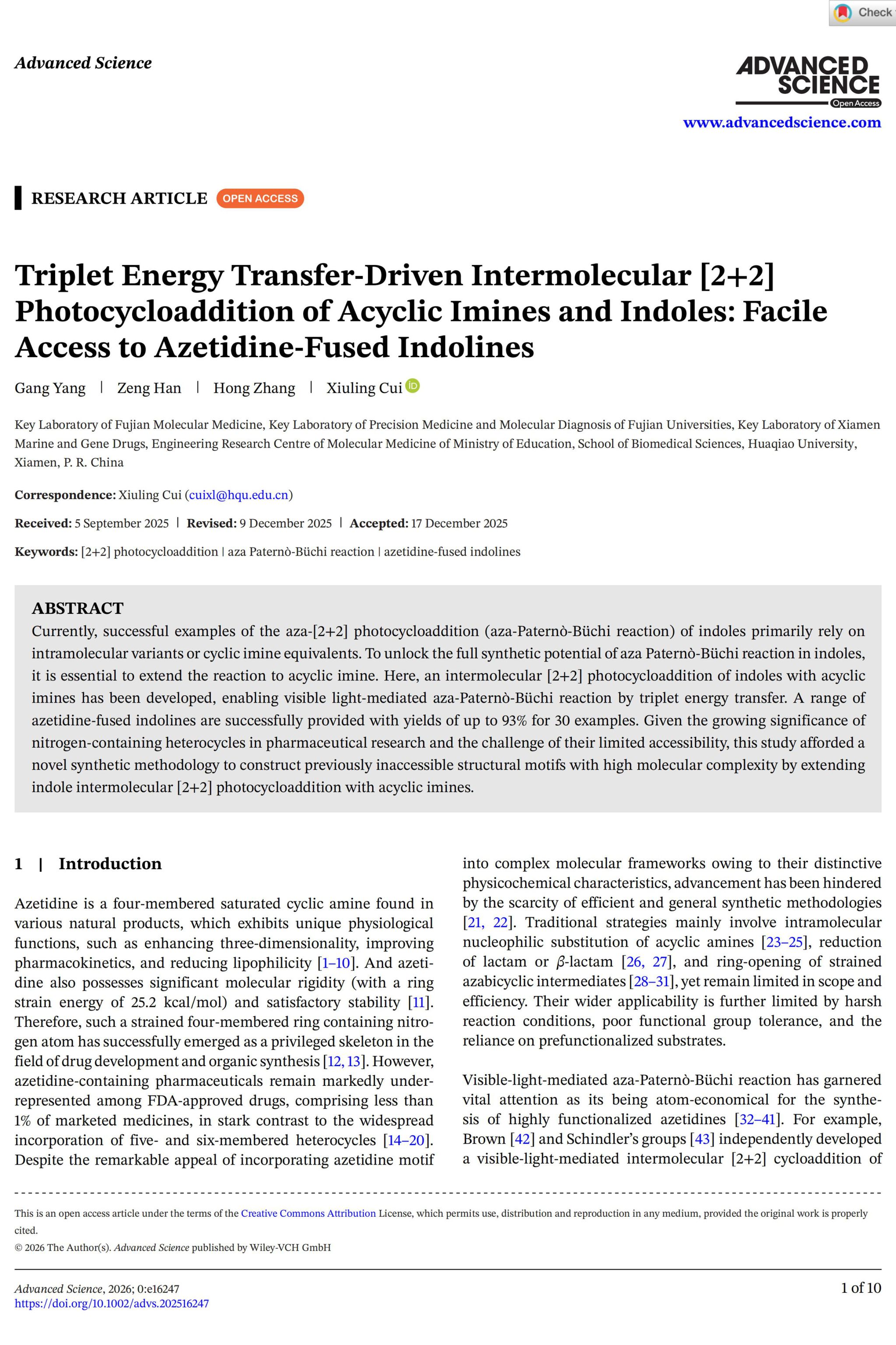 近日,beat365中文在线官网医学院崔秀灵教授团队在国际期刊《先进科学》(Advanced Science)上发表题为Triplet Energy Transfer-Driven Intermolecular [2+2] Photocycloaddition of Acyclic Imines and Indoles: Facile Access to Azetidine-Fused Indolines的研究论文,报道了一种以三重态能量转移驱动的可见光[2+2]环加成反应,实现了开链亚胺与吲哚的分子间aza-Paternò-Büchi反应,高效构筑稠合氮杂环丁烷结构单元。