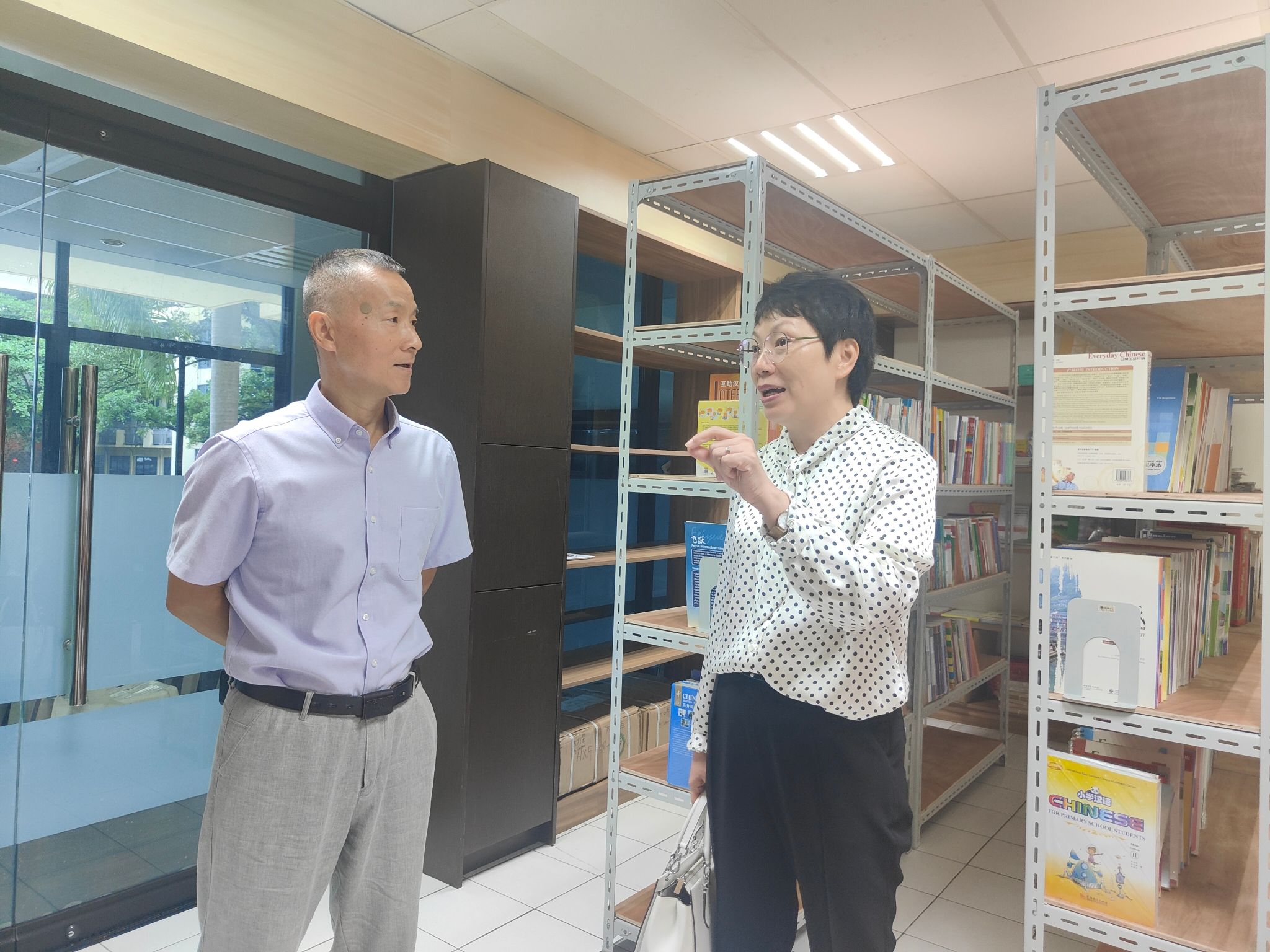 赵秀珍一行走访校园、孔院办公室、教室以及图书阅览室等区域,询问孔院馆藏图书数量与师生借阅情况。赵秀珍赞许孔院教室宽敞明亮,设施齐全,教学条件良好,为中文的国际推广工作提供了软件与硬件保障。