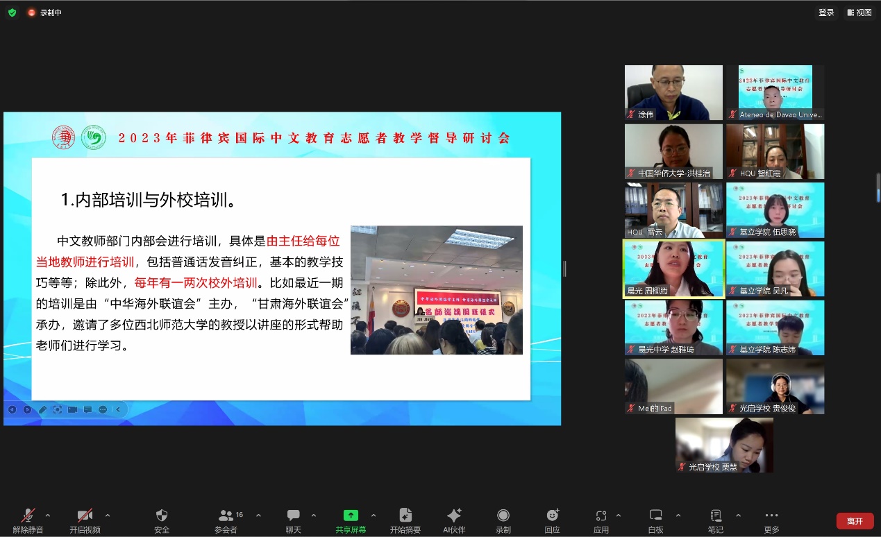 12月4日下午,beat365中文在线官网首场赴菲律宾国际中文教育志愿者教学督导研讨会于线上召开,9位赴菲志愿者教师汇报了任教华文学校的国际中文教育简况,分享了真实的教学案例与困惑。国际中文教育办公室主任、华文教育处处长涂伟,菲律宾达沃雅典耀孔子学院中方院长张胜林出席研讨会,华文教育研究院副教授洪桂治、华文学院讲师智红霞作为督导教师参会。