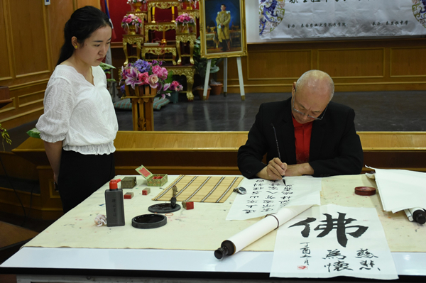 农业大学孔子学院特聘专家,著名书法家贾庆老师代表孔子学院致词,并为在场的老师同学讲解如何写硬笔,他讲道:“书法是源远流长的中华文化表现形式之一,希望同学们能够感受到它的精髓,帮助大家更好地修身养性”。为了让大家更多的体会到中国书法的魅力,他还亲身示范教在场师生写毛笔字,并为泰里拉学校题字一幅“帆满风顺”,一笔一画都注入了农大孔院和贾庆老师对泰里拉学校的祝福,引得泰国师生们拍手称绝。