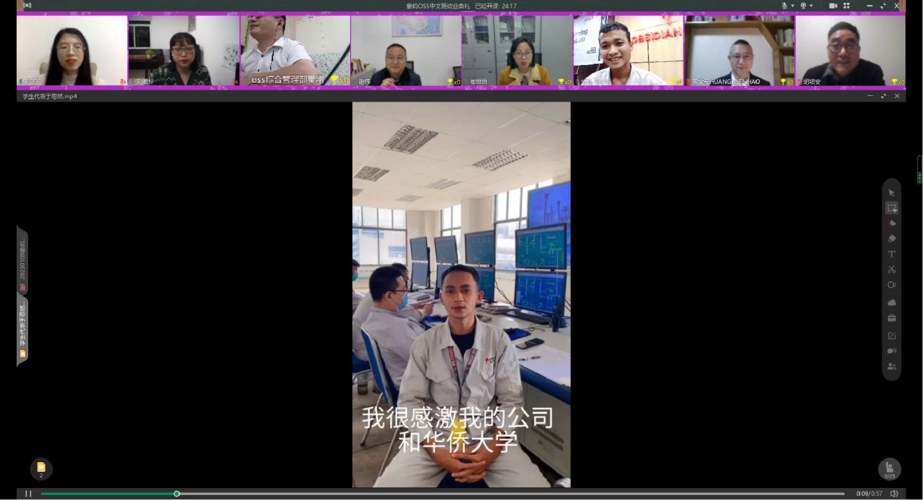 象屿OSS集团副总经理黄文豪感谢beat365中文在线官网为象屿集团印尼员工提供线上中文培训课程,并对同学们在这四个月的学习中取得的丰硕成果感到骄傲,鼓励同学们明确目标,树立远大志向,加强语言与技术的学习,成长为集团核心人才,成为中国与印尼之间的沟通桥梁。