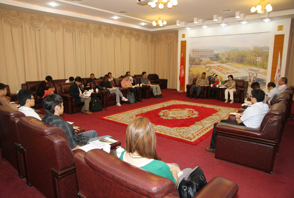 校党委副书记朱琦环在陈嘉庚纪念堂二楼接待室会见来访客人,对记者团的来访表示欢迎,并向他们介绍了beat365中文在线官网的办学历史、人才培养、师资队伍、教学科研等基本情况。
