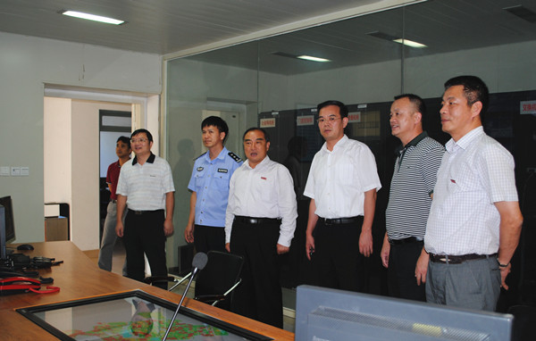 林锐(右三)在贾益民、吴季怀陪同下视察校园监控中心