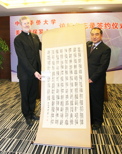 校长贾益民代表学校向德保罗大学赠送《百福图》