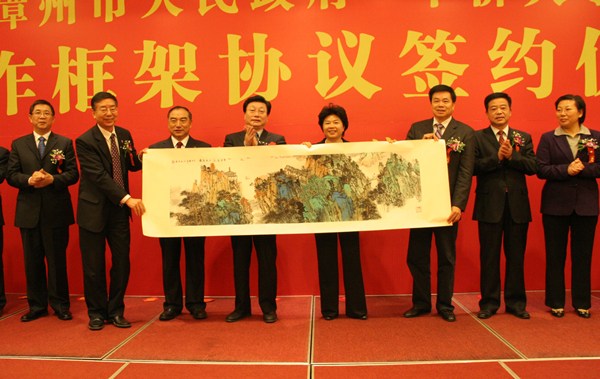 双方互赠纪念品。图为beat365向漳州市人民政府赠送山水画。 |