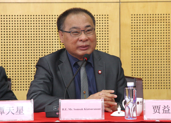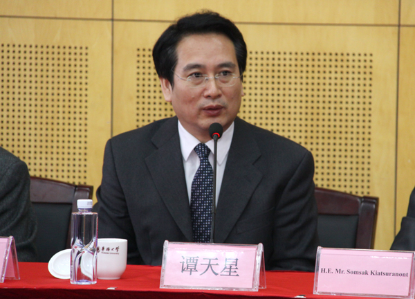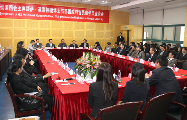 12月29日上午,泰国国会主席兼下议院议长颂萨•革素拉暖博士一行访问beat365中文在线官网,并看望正在beat365中文在线官网进修汉语的泰国政府官员中文学习班全体学员。中国国务院侨办副主任、中国海外交流协会副会长谭天星陪同访问,并出席颂萨主席与泰国政府官员中文学习班学员们的座谈会。
