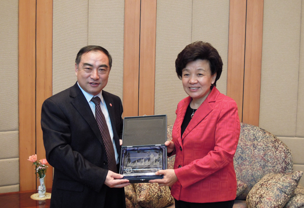 贾益民校长拜访香港中联办,图为与殷晓静副主任(右)互赠纪念品。