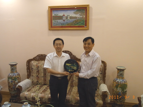 徐西鹏副校长向中国驻曼德勒总领事馆张建兴领事赠送纪念品(洪雪辉 摄)