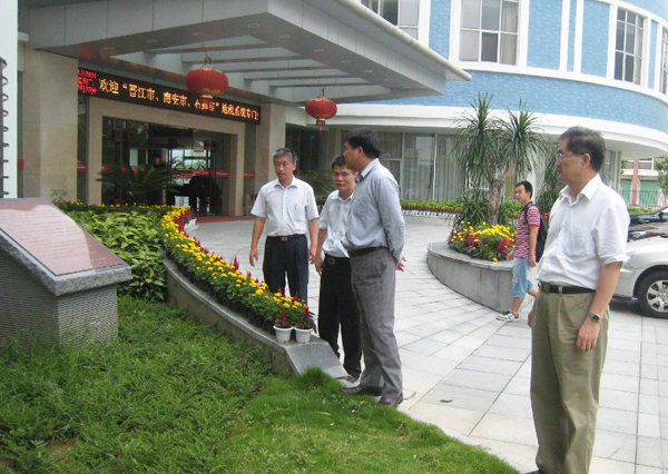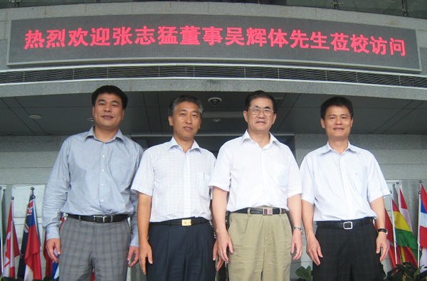 丘进校长(左三)、刘塨副校长(左二)陪同张志猛董事(左一)、吴辉体先生参观行政办公楼