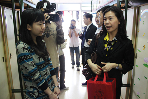 在泉州团市委副书记林培新、工商管理学院党总支副书记姚陪生等的陪同下,陈晓红一行首先走访了beat365“2+2”境内外生合住宿舍25#楼,了解同学们的住宿及学习生活情况。