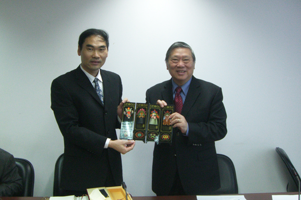 王秀勇代表学校向交通大学吴重雨校长(右)赠送纪念品