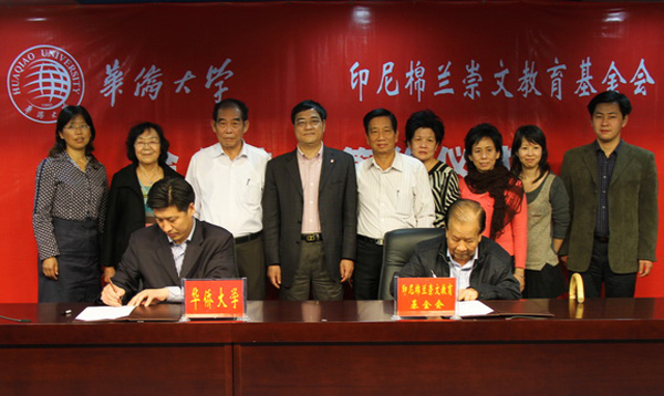 会谈结束后,双方在厦门校区行政研发大楼401会议室签署合作协议。华大华文教育办公室主任赵明光、印尼棉兰崇文教育基金会董事会主席黄两承,分别代表双方签署协议。张禹东副校长与印尼棉兰崇文教育基金会访问团成员共同见证签约。
