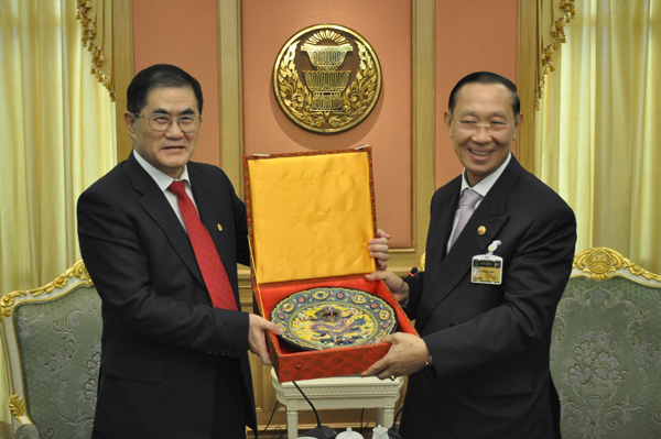丘进校长与泰国上议院巴索素议长(右)互赠纪念品