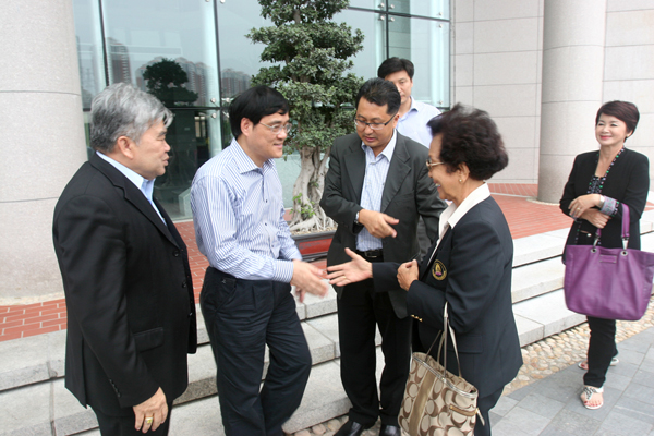 张禹东副校长(左二)在行政研发大楼前迎接来宾