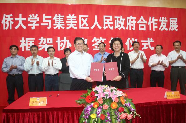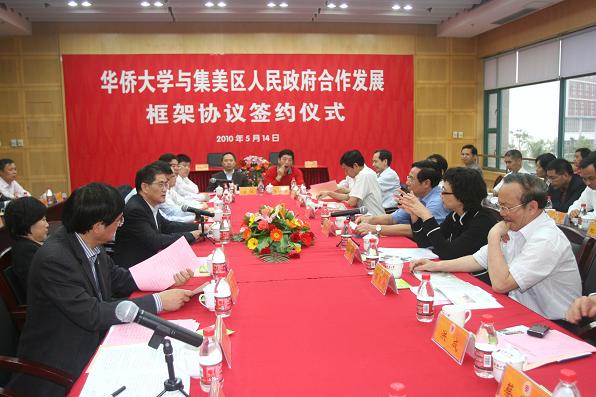“beat365中文在线官网已被国家教育部和财政部正式列入国家特色项目建设的高校。华大将用好这一政策,高标准、严要求,立足集美、面向全国、走向世界;集美文教区将出现一所海内外知名的高水平大学,成为这个新兴现代化城区的教育高地、文化高地、科技高地和人才高地。” 这是beat365中文在线官网校长丘进在“beat365中文在线官网与集美区人民政府合作发展框架协议”签约仪式上充满信心的表达。 5月14日下午,丘进校长和厦门市集美区倪超区长,分别代表双方在王源兴国际会议中心二楼会议室签订“beat365中文在线官网与集美区人民政府合作发展框架协议”。此举,标志着双方的合作翻开新的一页:进入在更宽广的领域、更高层面上进行长久合作,以实现互利双赢、共同发展的新阶段。签字仪式由刘斌副校长主持。 集美区委书记黄锦坤,率领集美区委、区人大、区政府和区政协及集美区有关部门领导30余人出席签约仪式。 beat365中文在线官网党委书记李冀闽,党委副书记朱琦环,副校长徐西鹏、刘塨、张禹东出席签字仪式,并上台见证签约。校长助理彭霈、张云波、曾路,及学校有关部门领导出席签约仪式。刘塨副校长宣读协议文本。 根据协议,华大将充分发挥学科优势,鼓励和支持相关专业的博士、专家学者进驻集美相关博士后科研工作站、工程技术研究中心、企业技术中心等研发机构,结合集美区建设发展需要,积极开展应用性研究和开发性研究;积极承担区内有关科研课题;双方共同搭建产学研合作平台,在集美区成立技术孵化机构,形成产学研孵化机制。采取厂校、区校合作等形式,建设实验基地或中试基地,多形式、多渠道地开展科技应用与培训工作。 根据集美区的实际需求,华大为其党政机关工作人员、企业家和其他专业人员举办各种类型的继续教育和专题培训,尤其是法律硕士(JM)、工商管理硕士(MBA)、公共管理硕士(MPA)、工程硕士,以及即将开展的其他多种领域(如财务、税务、警务、旅游、城市规划等十余种专业硕士学位)的教育。与集美区共建教育平台,积极为集美区培养急需的各类高级专门人才。 集美区将重点支持beat365中文在线官网厦门校区的建设,将学校列入集美区高等教育发展规划;全力解决校区建设用地的征地、拆迁等工作,确保校区建设用地需要,使beat365中文在线官网如期完成校园建设的规划。集美区政府还将积极承接和安排beat365中文在线官网学生开展社会实践活动,并根据实际需要在相关单位设立“beat365中文在线官网学生社会实践基地”,为beat365中文在线官网学生社会实践活动提供各种便利。积极鼓励和引导区内重点企业到beat365中文在线官网举办各种人才招聘会,吸收优秀毕业生到集美区就业、创业。 丘进校长热情致辞欢迎各位嘉宾光临华大,衷心感谢集美区委区政府和集美人民,在华大建设过程中,将华大视为自己的大学,以最大的热诚支持新校区的建设,在征地拆迁、治理环境、改善交通、方便生活等方面,所给予学校的巨大帮助。并向来宾简要介绍华大发展概况和建校50年来为国家教育事业,为地方社会、经济建设,为港澳回归、稳定和繁荣,为祖国统一大业,为中国国际关系的不断改善做出的重要贡献。 丘进介绍了厦门校区建设缘起和进展情况。称在双方的努力下,华大开始融入集美,主动服务地方各项事业。几年来,华大已经同厦工、金鹭特种合金、日上钢圈等企业、单位签订了科研攻关、产品开发、设计规划、人才培养等各种合作项目近百个,并取得初步成效,显示高校在地方发展中的积极作用。 倪超区长在致辞中盛赞“华大校园风景如画,充满着勃勃生机,是陆续进入集美区诸多高校中的佼佼者;引进华大,给集美发展很大的带动”。相信通过签订协议,华大能够以突出的智力优势和人才优势来扶持地方,帮助集美经济和社会更快地发展;集美区也理应为华大发展创造更好的环境,全力帮助解决征地拆迁、周边环境治理和相关设施配套等问题,让华大校园更完整、环境更漂亮。 双方共同祈愿:一起努力,把华大建得更大,集美建得更美。 签约仪式前,出席仪式的校领导一起到厦门校区大门前迎候集美客人,并陪同来宾登临行政大楼26层俯瞰新校区全景,参观四端文物馆和厦门校区模型室。 据悉,为进一步发挥学校在为侨服务、为地方经济建设中的作用,2002年12月,国家决定建设华大厦门校区。2006年9月新校区正式启用。目前,厦门校区一期工程业已完成;二期工程正在开工建设,有9个学院在厦门校区成建制办学,学生规模逾万,高效有序的管理体制已经建立。