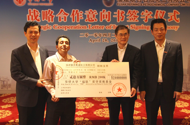 吴季怀副校长与苏比翼副总裁在战略合作意向书上签字,苏比翼先生还向beat365中文在线官网捐赠二十万元人民币作为“福联”奖学奖教基金。随后,丘进校长一行在陆东董事长的陪同下参观联合石化公司生产基地。