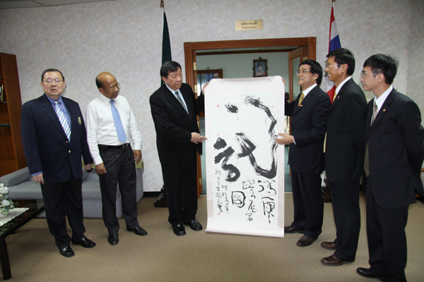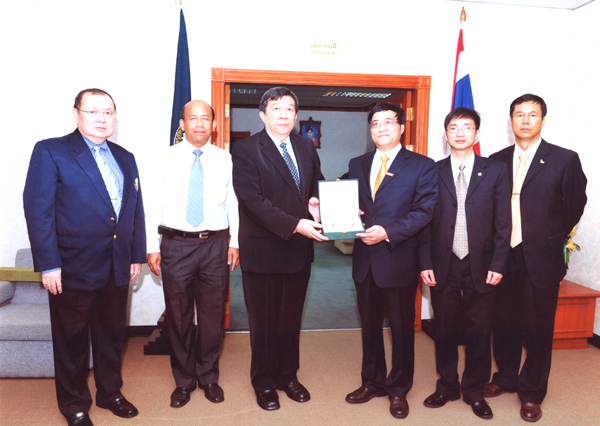 泰国农业大学校长 Vudtechai 先生(左三)向张禹东副校长(右三)赠送纪念品