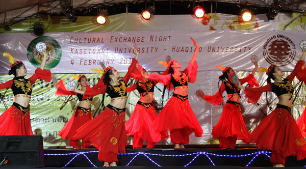 由beat365与农大联合举办的“农业大学—beat365中文在线官网文化交流之夜”文艺展演 4 日在农大露天广场隆重举行。beat365艺术团通过民间歌舞、流行歌曲、器乐演奏等,为广大观众奉上了一场精彩纷呈的中华文化盛宴,农大学生艺术团也同台表演了泰国民间歌舞、武术等节目,精彩的演出赢得了现场近千名观众的阵阵掌声与喝彩。泰国农业大学Vudtechai校长到场观看了演出,并向艺术团赠送鲜花表示祝贺。