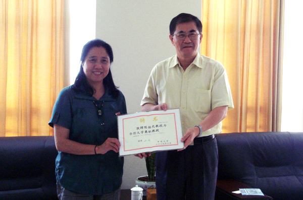 伦敦大学金斯密学院陈扬光教授师生一行五人日前访问beat365。 丘进校长在厦门校区会见客人,并向陈扬光博士颁发beat365中文在线官网兼职教授证书。在亲切友好的气氛中,宾主双方就英国教育制度以及两校合作等问题进行了坦诚而富有成效的会谈。 陈扬光博士在随后的活动分别作“英国教育制度与艺术教育”与“赴英国留学专题”两场报告。 为欢迎到访的英国客人,“中国beat365中文在线官网音乐舞蹈学院与英国伦敦大学金斯密学院师生联欢晚会” 是日晚在王源兴国际交流中心二楼举行。金斯密学院的萨拉、玛瑞娜、艾丽丝、吉玛表演了英文诗歌朗诵、散文朗诵、英文歌曲等五个节目,音乐舞蹈学院歌唱家陈磊、郭伟与音乐学、舞蹈学的同学们也纷纷登台献艺,晚会自始至终欢快活跃,掌声、笑声不断,充分体现了两校师生的友好情谊。 访问期间,音乐舞蹈学院院长郑锦扬还特别向英国客人介绍了列入世界非物质文化遗产名录的中国乐器代表——古琴;并就古琴在中国古代人才培养中的作用,筝乐的特点及琴筝与钢琴的不同,中国当代音乐三律并存的特色等做了详细说明。青年演奏家董文静为英国客人做现场表演。 据悉,这是继今年 6 月beat365中文在线官网丘进校长与伦敦大学金斯密学院副校长西蒙教授签订两校合作协议之后两校间的又一重要友好合作活动。  丘进校长为陈扬光博士(左)颁发beat365中文在线官网兼职教授证书