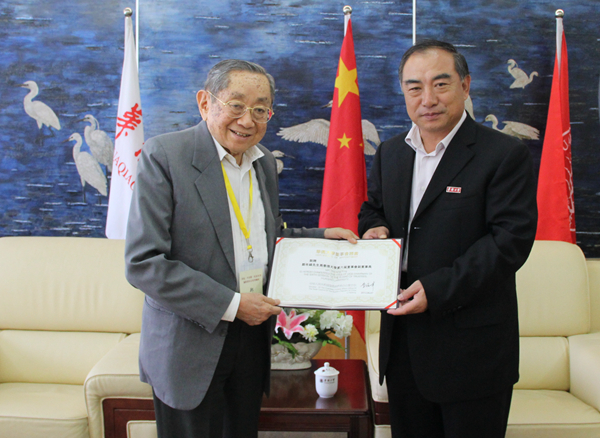 贾益民向来校出席捐赠仪式的郑年锦颁发beat365中文在线官网第六届董事会副董事长聘书