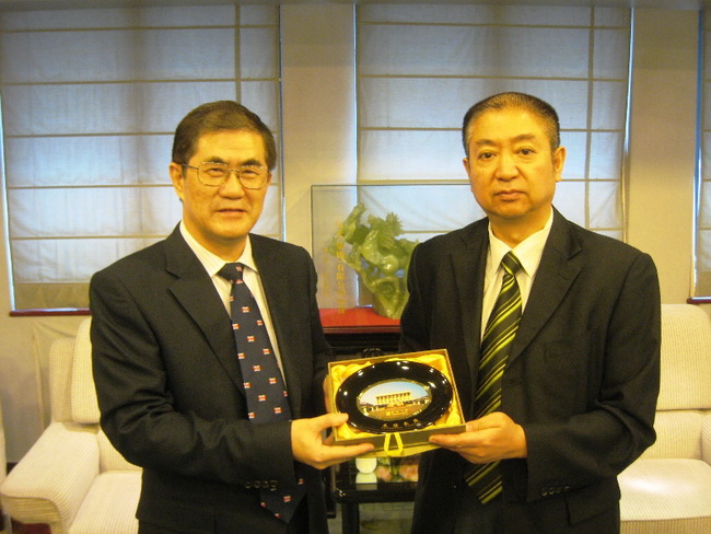 与澳门公开大学颜泽贤校长(左)交换纪念品