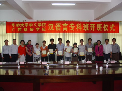 3 月 23 日 ,beat365中文在线官网华文学院与广西华侨学校联合举办的汉语言专科班开班仪式在广西华侨学校举行,广西壮族自治区侨办林荣蓉副主任、华文学院副院长李晓洁、广西华侨学校校长甘武军及 20 位汉语言专科班留学生出席了开学典礼。
