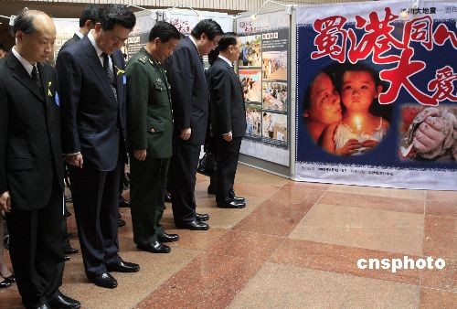 五月十二日,《蜀港同心 大爱无疆》汶川大地震一周年纪念图片展在香港文化中心举行,图为香港特区行政长官曾荫权、中央政府驻港联络办主任高祀仁、驻港部队司令张仕波等出席展览并默哀悼念地震中遇难者。 中新社发 张勤 摄
