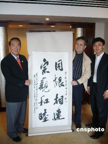 四月六日,亲民党主席宋楚瑜在河南郑州会见著名书法家、河南省嵩阳书画院院长宋卫国。宋卫国向宋楚瑜赠送《同根相连 宗亲和睦》的字幅。 中新社发 王中举 摄