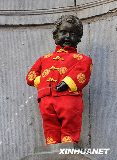 3月2日,在比利时首都布鲁塞尔,有“布鲁塞尔第一公民”之称的小尿童雕像穿上了由中国浙江省海宁市赠送的皮质中国传统服装。