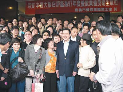 马英九于前晚夜宿嘉义市中信饭店,1日一早在饭店前,巧遇100多名大陆旅客,都挤着要和他合影,马英九所幸主动走入大陆游客群中来个大合照。