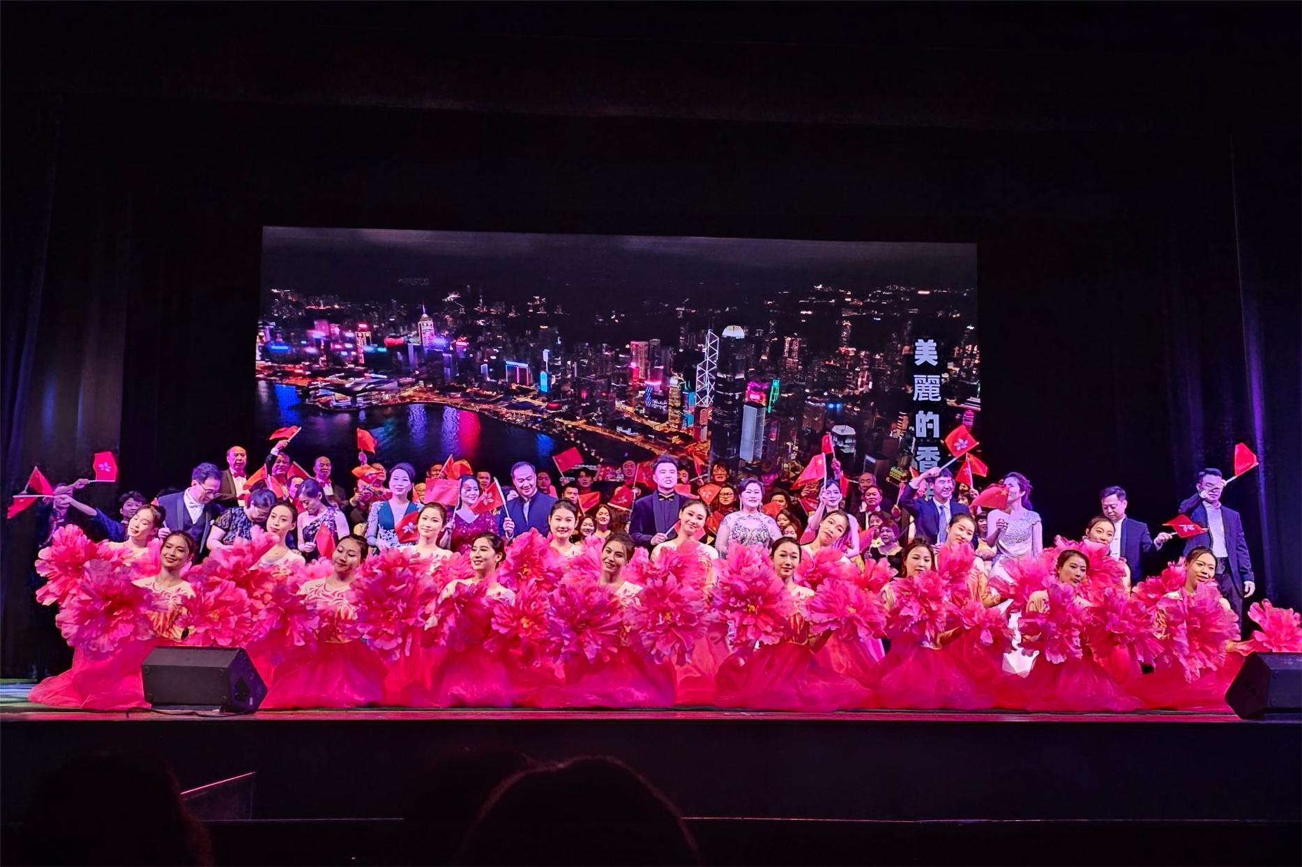 黄楚基致辞时表示,晚会旨在庆祝香港回归祖国26周年和中华人民共和国成立74周年,同时也为响应香港特区政府民政事务总署推出的“祖籍联系 思祖寻源”同乡文化推广活动。他说,新中国成立74年来,国家发展成就举世瞩目,中华民族伟大复兴进入了不可逆转的历史进程。今年是全面贯彻党的二十大精神的开局之年,也是香港发展步入由治及兴新阶段关键期的起步之年。随着中国式现代化建设的不断推进,香港也正奋力迈向高质量发展,相信在“一国两制”方针坚实保障下,香港定能创造更多辉煌,“东方之珠”必将更加光亮夺目。他希望这次歌舞演出能够广泛传扬侨胞的爱国情怀,讲好中国故事,凝聚侨心,汇聚侨力,让爱国精神薪火相传。