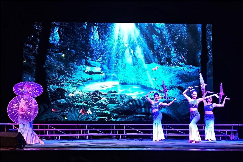 晚会现场人山人海,座无虚席。身着蓝紫色衣裙、手持粉紫色油纸伞的少女于舞台中翩然起舞,结合舞台背景墙上的潺潺流水,为观众带来了如梦似幻的视觉奇旅。晚会表演节目以歌舞、器乐合奏为主,其中更有傣族舞蹈、蒙古族舞蹈等颇具少数民族特色的演出,向观众展现出中华文化的多元魅力。