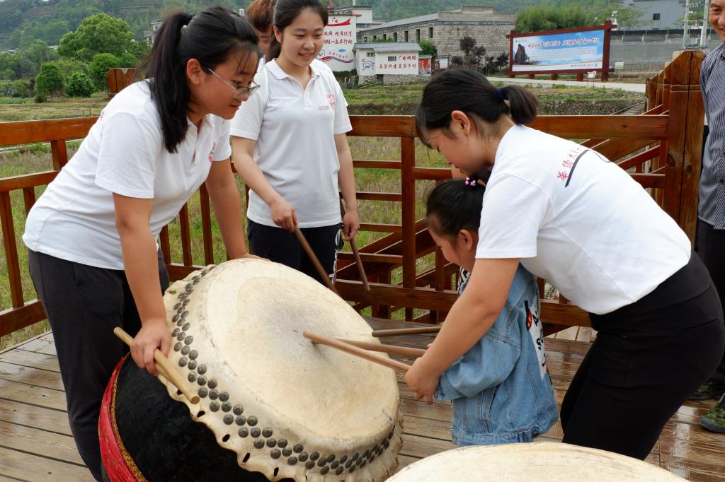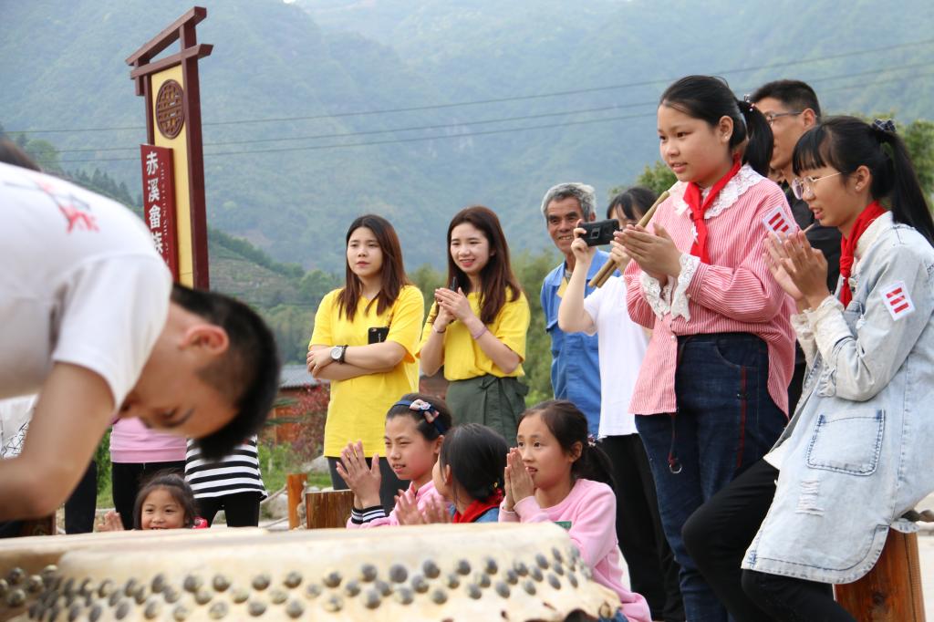 学习调研后,二十四节令鼓的鼓手们在赤溪村村口进行了以谷雨节令为主题的鼓乐表演。轻松、欢快又不失鼓韵的展演,吸引了乡村老少前来观看与互动。“我们行前和老师提出,不希望村干部专门组织村民来观看,我们不担心观众人数。我们就想在谷雨时节,在这个美丽而有特殊发展历程的乡村,敲响节令鼓,作为我们致敬农耕文明、致敬乡村振兴的一种声音”。来自台湾的鼓手林恩立继续说道,“今天过得很开心,让我看到了赤溪村的发展变化,村民们辛勤劳动,小朋友们的笑脸那般灿烂,我们应当运用自己有限的能力来帮助更多贫困乡村”。菲律宾华侨庄临临同学动情地说,“我喜欢一切真实、淳朴的事物,真实才能体现美,看着孩子们拿起鼓棒,眼中露出对新事物好奇的目光,脸上的笑容感染着我们每一个人”。