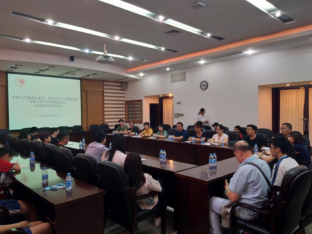 在汉语普通话推广的座谈会上,华文教育处的工作人员用丰富的图片和具有说服力的数据介绍了beat365中文在线官网汉语推广的方法和成效。澳门青少年教育促进会和泉州市中小学教师代表双方分别介绍了各自的汉语教育情况和经验,并且请“汉语英雄”获奖学生发表了感想。座谈气氛欢快热烈,为之后联系和学习交流打下了良好基础。
