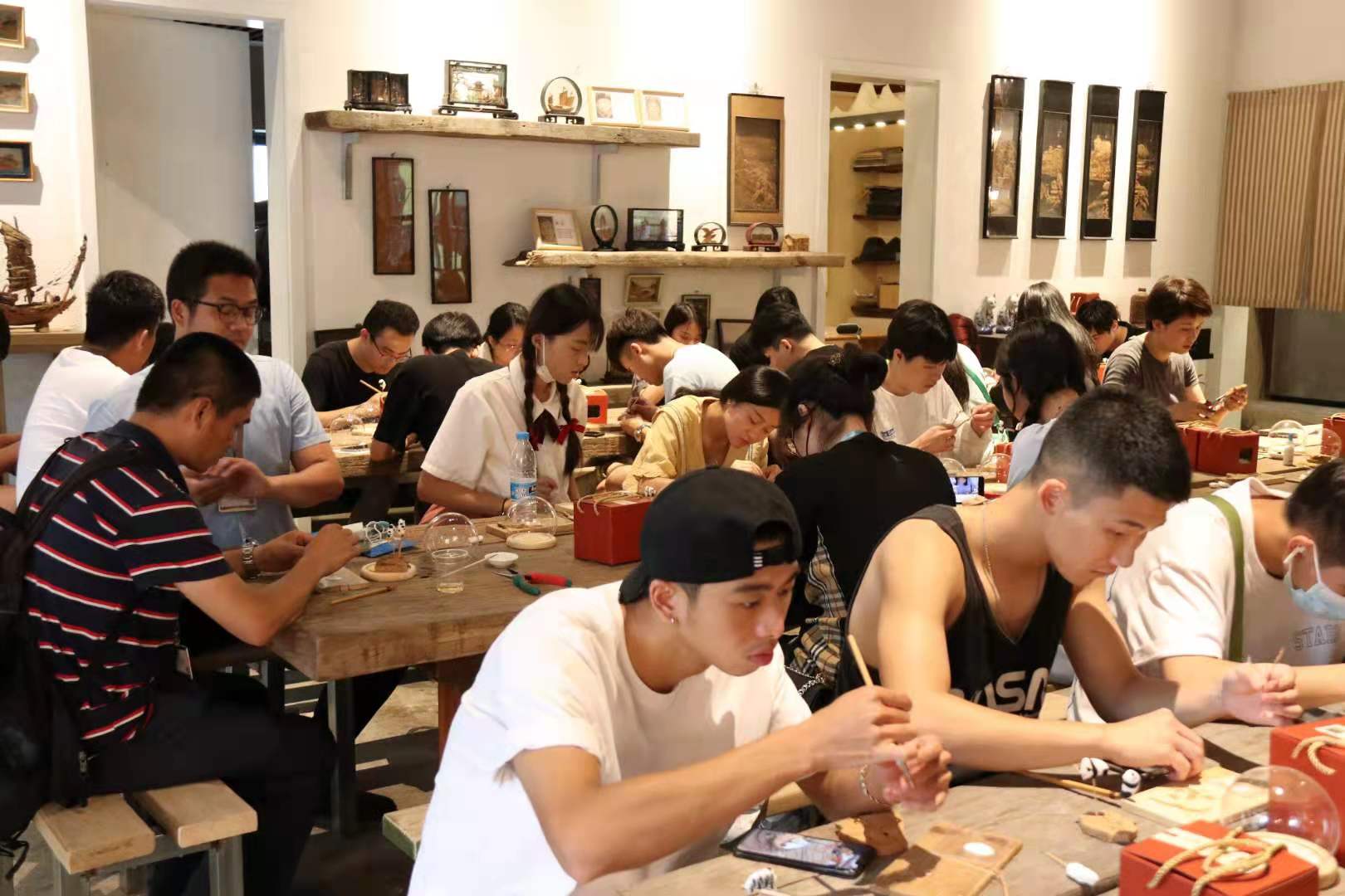 师生一众还体验了非遗文化软木画,在课堂上了解了软木画的文化、历史,并参观了软木画工厂,近距离感受老艺人制作软木画的过程,还创作独属于自己的软木画,亲身感受软木画的魅力和福州工匠坚持传承传统工艺的匠心精神。