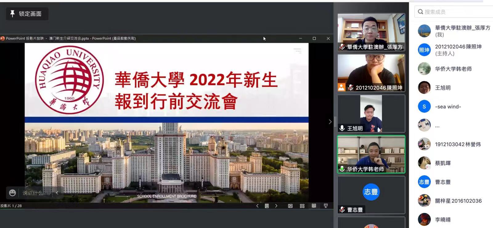 招生处、澳门联络处的相关负责老师及澳门同学会的同学参加交流会。澳门同学会总干事陈照坤,副总干事王旭明、吴颖芝先后通过PPT详细罗列了报到准备清单,介绍了校园文化生活,传授了各自的适应学习技巧,并与新生们共同憧憬未来丰富的校园学习和生活。招生处和澳门联络处老师从学校概况、招生详情、防疫要求及报到注意事项等方面作了详细介绍。