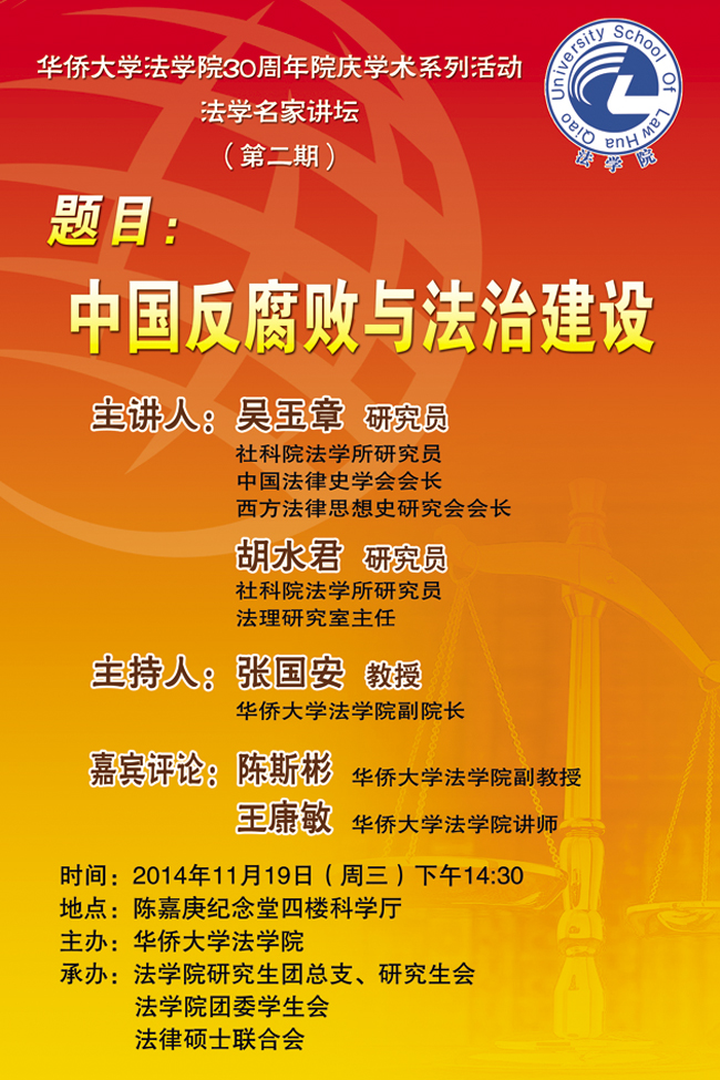 预告:法学院30周年院庆学术系列活动之法学名家讲坛:吴玉章、胡水君《中国反腐败与法治建设》