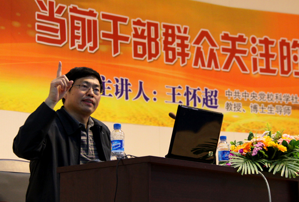 在题为“当前干部群众关注的热点问题”的报告中,王怀超主要讲述了当前贫富差别和资源环境两大问题。王怀超说,我国改革开放 30 年成就巨大,但忽视了分配问题,突出表现在城乡差别、地区差别、行业差别上,他称,贫富差别已成为影响社会稳定的重要因素。谈及资源环境问题,王怀超忧心忡忡,新中国建国 60 年成就瞩目,但 30 年快速发展却付出了沉重的资源环境代价。我国资源总量和人均资源都严重不足,而资源消耗的增长速度却十分惊人,浪费十分巨大。王怀超说,资源能源问题已不是一个经济问题,而是一个国家安全问题。王怀超还以具体翔实的数据,和自己的耳闻目睹的亲身经历,讲述当前土地荒漠化、空气污染、水污染等环境问题的严峻。